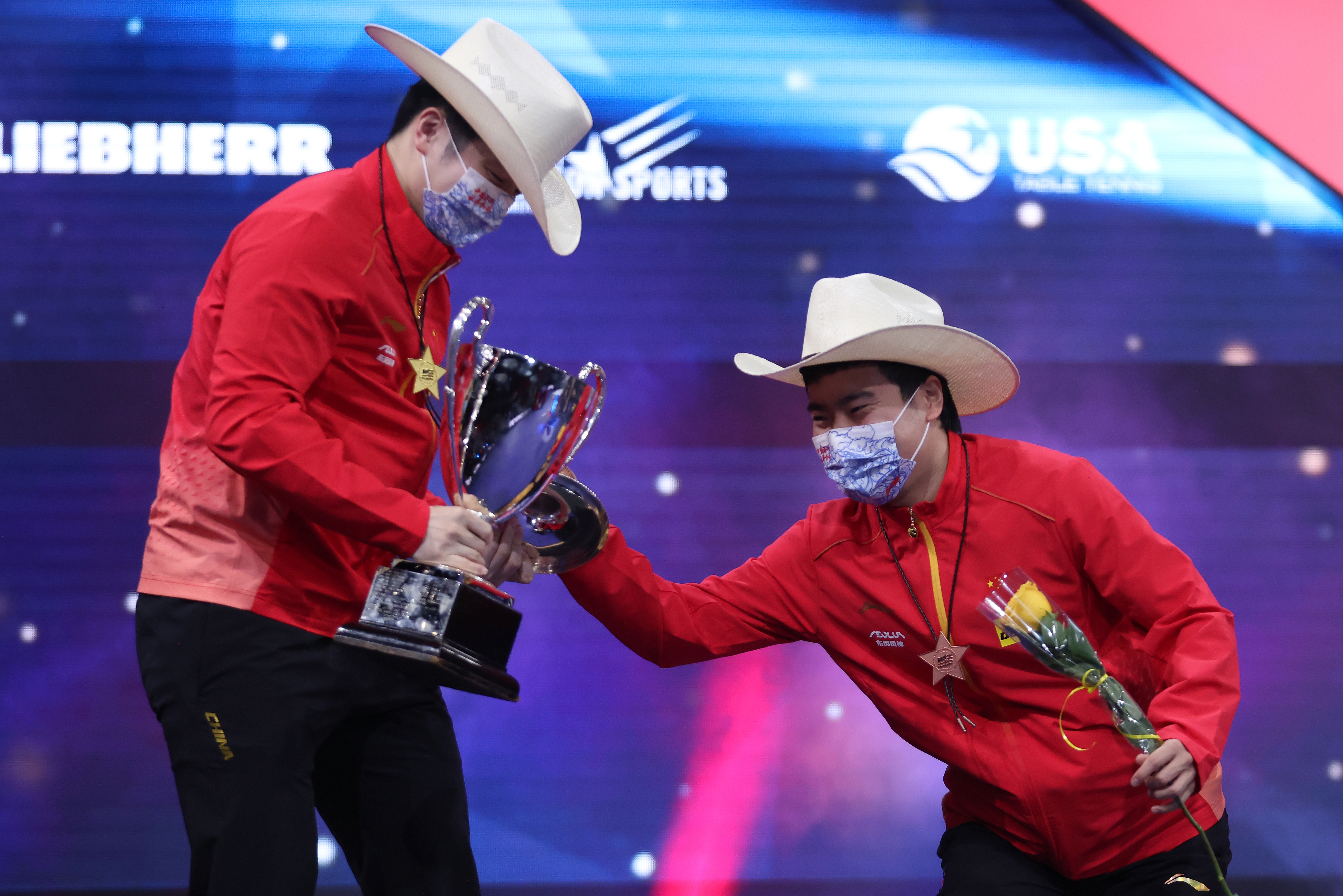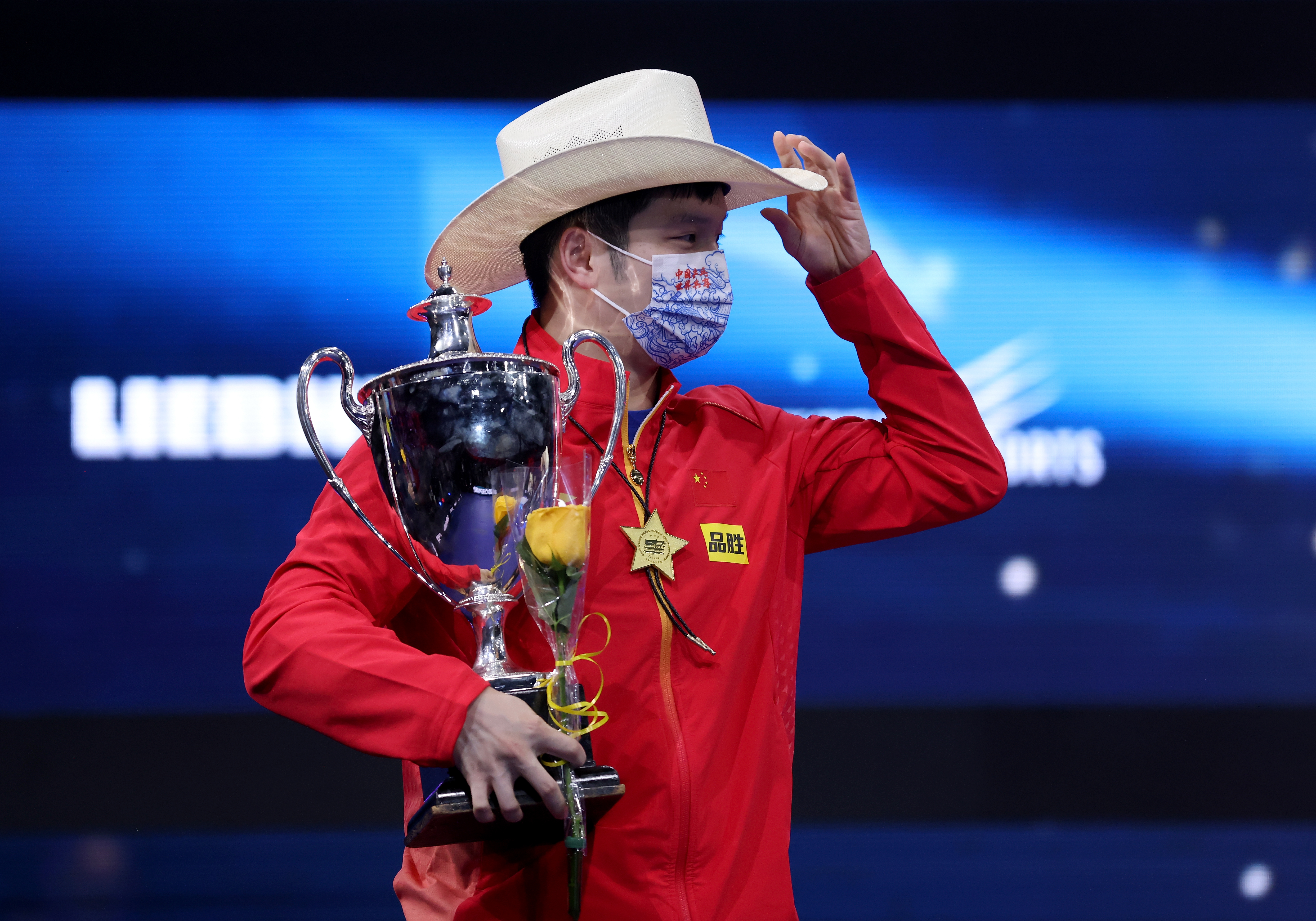 在男單頒獎(jiǎng)儀式上,戴著牛仔帽的樊振東正準(zhǔn)備高高舉起男單冠軍獎(jiǎng)杯圣?勃萊德杯。豈料杯蓋突然滑落并砸中了他的頭,好在他當(dāng)時(shí)戴著牛仔帽。樊振東憨憨地護(hù)了護(hù)帽子,又連忙轉(zhuǎn)身找尋失落的杯蓋,男單季軍梁靖崑忍住笑把杯蓋撿起來并遞給樊振東。雖然兩人都戴著口罩,但是人們還是可以看到他們都被此情此景逗樂了。在現(xiàn)場(chǎng)或者直播看到這一幕的球迷更不用說感到多歡樂,關(guān)于樊振東“中頭獎(jiǎng)”的視頻和表情包更是瞬間傳遍網(wǎng)絡(luò)。