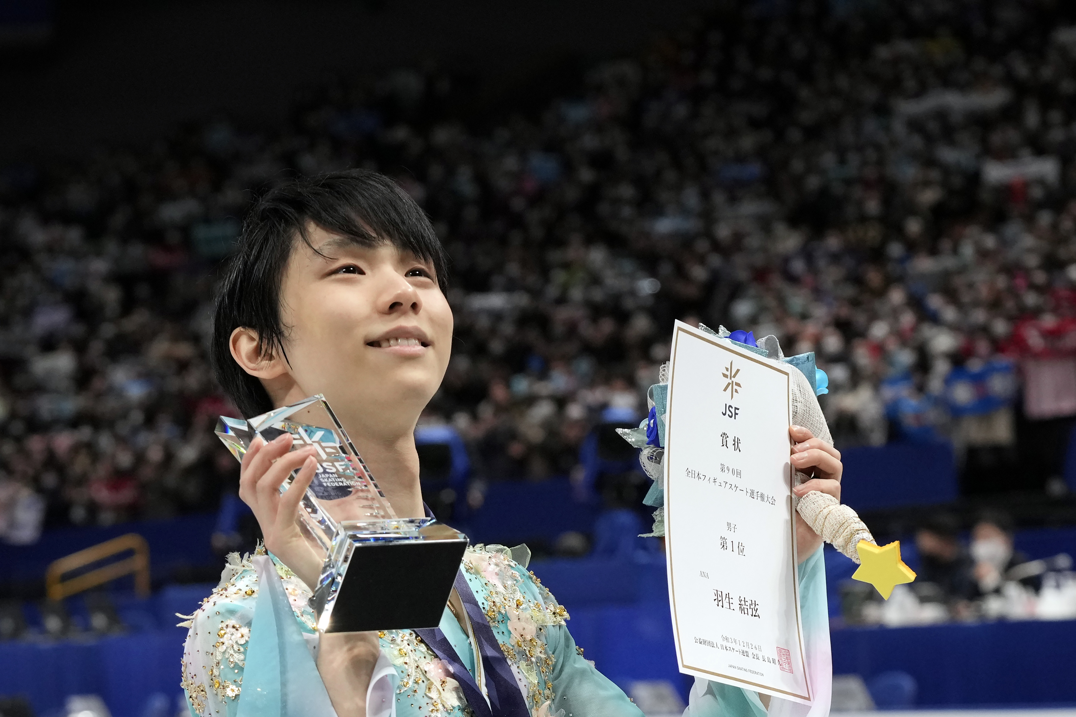 在12月23日的賽前訓練中,羽生結(jié)弦三度挑戰(zhàn)4A,一次單足落冰,引起巨大轟動。在24日的男子單人滑短節(jié)目比賽中,他順利地先聲奪人暫列第一。在25日的賽前訓練中,他嘗試了至少10次4A,但是沒有成功,只有一次雙足落冰。今晚,羽生結(jié)弦在自由滑《與天共地》的一開始就嘗試4A,周數(shù)不足但安全雙足落冰,之后,他的發(fā)揮近乎完美,斬獲自由滑第一。加上短節(jié)目的第一,他以總分322.36奪冠,繼2012年、2013年、2014年、2015年、2020年之后,第六度在全日本錦標賽封王。