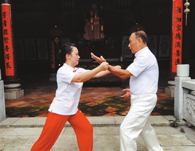 “食過(guò)夜粥”(粵俗語(yǔ),指會(huì)功夫、懂武術(shù))的武林中人,總會(huì)用生動(dòng)、地道的方言來(lái)描述他們熱愛(ài)的功夫,劉家拳中就有一句拳諺“蠄蟧爪(蠄蟧粵語(yǔ)指的是一種蜘蛛,蠄蟧爪則是形容劉家拳的橋手快速敏捷)、蝦公腰(在腰力的運(yùn)用上要有蝦腰一般的爆炸力)”。記者在拍攝時(shí)特意請(qǐng)蕭永定和他的孫女、劉家拳第五代傳承人蕭美泳一起來(lái)演繹這一動(dòng)作特點(diǎn)。