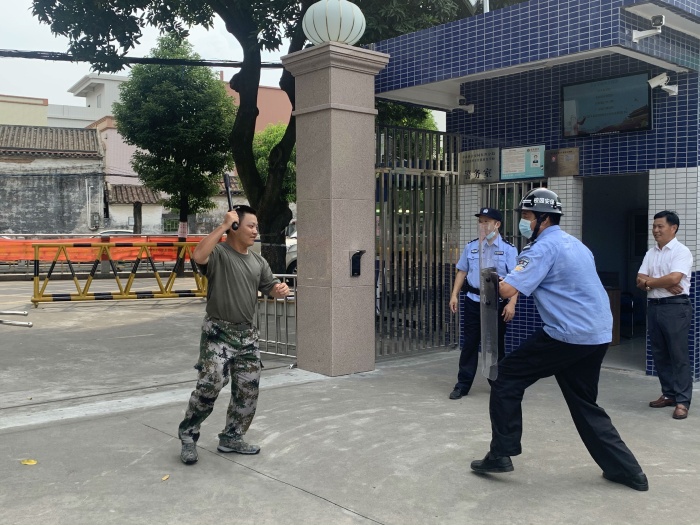 隨后,李警官聯(lián)合學(xué)校安保人員及教師進(jìn)行反恐防暴演習(xí)。演練模擬設(shè)置一名“暴恐分子”欲強(qiáng)行沖闖校園,學(xué)校安保人員立即持械趕到現(xiàn)場進(jìn)行制止,與“歹徒”展開搏斗。關(guān)鍵時(shí)刻學(xué)校一名保安立即拿起身上的鋼叉刺向“歹徒”,另一名保安在盾牌的掩護(hù)下試圖控制“歹徒”,對負(fù)隅抵抗的“歹徒”進(jìn)行布控和抓捕。整場演練有條不紊、井然有序,安保人員積極參與,取得圓滿成功。