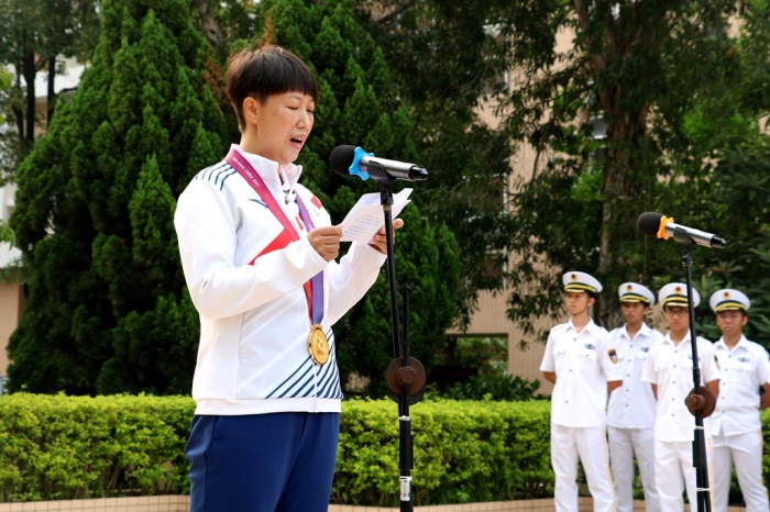 歡迎冠軍回家,在隆重的升旗儀式中拉開序幕。首先,由傅彬同學代表永中全體師生為孫麗艷老師獻上鮮花,祝賀她載譽歸來!全場沸騰,響起了經久熱烈的掌聲。冠軍是榮耀,冠軍是令人羨慕!這是廣東省人民的驕傲、中山市人民的驕傲、小欖鎮(zhèn)人民的驕傲,更是永中師生的驕傲!