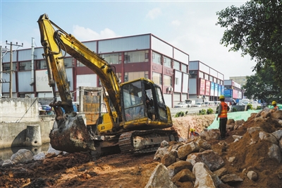 11月4日,工人正在沙溪鎮(zhèn)黑臭水體整治現(xiàn)場作業(yè)。