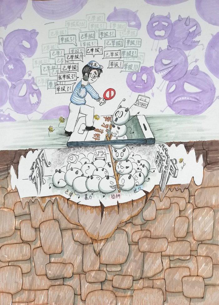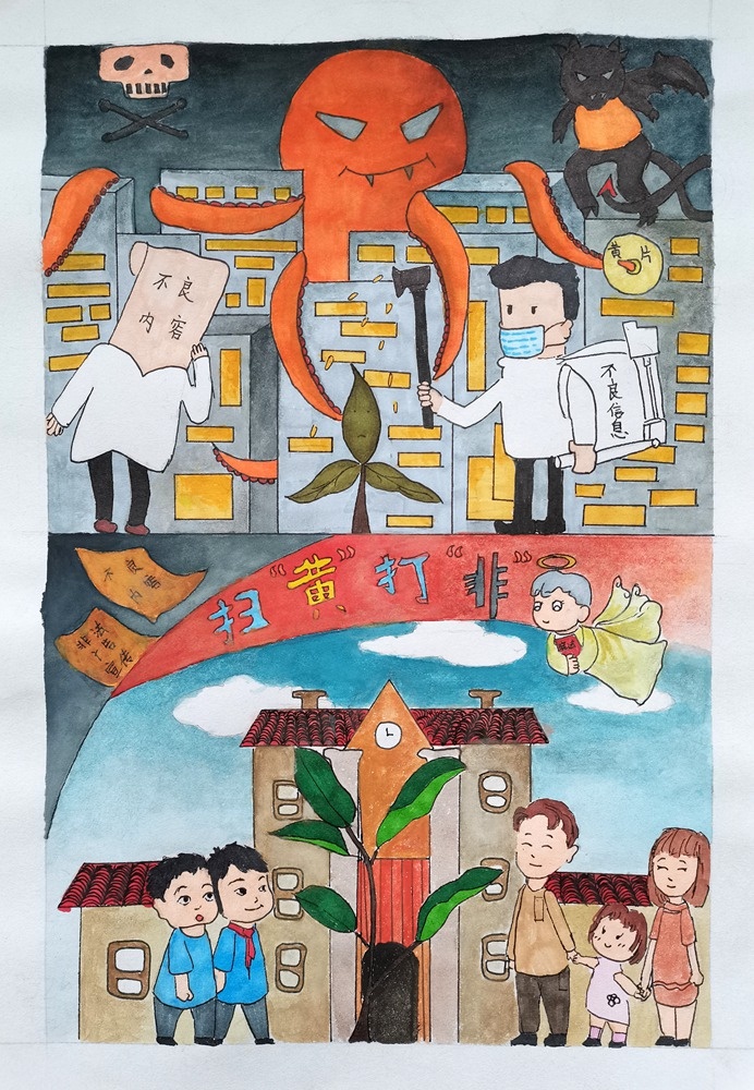 同學們接到比賽通知后,積極參與,在美術老師的指導下,認真創(chuàng)作,幾天時間就上交作品100多幅。經(jīng)過美術科組專業(yè)老師的認真評選,評出一、二、三等獎60多幅,學校將把優(yōu)秀作品上交參加2021小欖鎮(zhèn)的“掃黃打非”漫畫、連環(huán)畫評選活動。