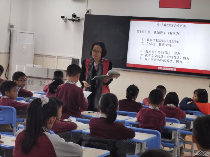 緊接著,是學(xué)生分組匯報(bào)環(huán)節(jié)。學(xué)生在指導(dǎo)下,完整而清晰地匯報(bào)自己的學(xué)習(xí)所得。一個(gè)學(xué)生匯報(bào)完,緊接著下一個(gè)學(xué)生補(bǔ)充,學(xué)生由一開始的拘謹(jǐn)漸漸變得大方,對(duì)學(xué)校的了解也逐漸深入,課堂的學(xué)習(xí)氛圍愈發(fā)濃厚。