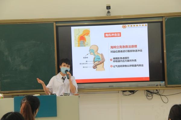 本次培訓(xùn)主要由廣東省紅十字會急救培訓(xùn)師、東鳳醫(yī)院健康教育科主任范蓮瑩主講,她以圖片及互動的教學(xué)方式為大家講解應(yīng)急救助的流程、心肺復(fù)蘇和海姆立克法,強調(diào)救護“黃金四分鐘”的重要性,現(xiàn)場講師不僅進行了詳細(xì)地理論知識講解,還向師生們演示了大人氣道異物梗阻急救的方法——胸外按壓、海姆立克法等急救技術(shù),醫(yī)生還以模擬橡膠人為器具,現(xiàn)場演示了正確的嬰兒氣道異物梗阻的急救方式。師生們聽得津津有味,并積極參與體驗操作。