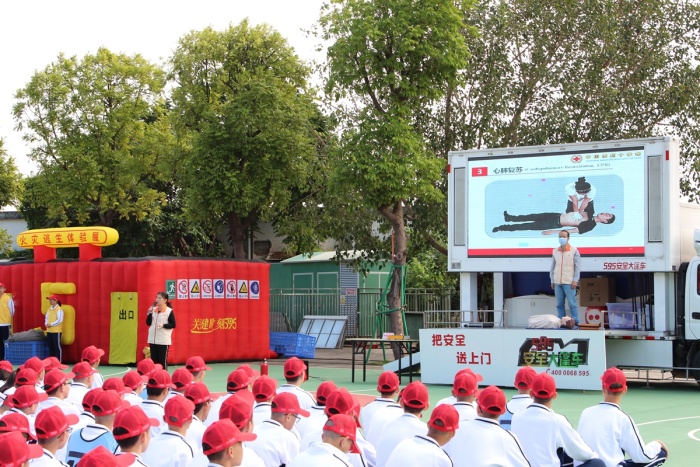 本次的應(yīng)急救護(hù)培訓(xùn)內(nèi)容分為心肺復(fù)蘇、常見急癥處理等應(yīng)急救護(hù)知識(shí)講座、大篷車實(shí)踐體驗(yàn)環(huán)節(jié)、“強(qiáng)技能”主題交流。在體育館的同學(xué)們、班主任們、軍訓(xùn)教官們認(rèn)真觀看著市紅十字會(huì)黎子丹老師和梁潤泉助教的精彩授課,時(shí)而傳來陣陣掌聲。在操場(chǎng)進(jìn)行的是大篷車體驗(yàn)項(xiàng)目,在學(xué)校黨委委員李燦澤同志的介紹下,市紅會(huì)何玉珍、高小紅等老師開始進(jìn)行了心肺復(fù)蘇、止血包扎等講解,隨后師生們進(jìn)行火災(zāi)逃生模擬、醉駕模擬、觸電模擬、滅火器使用、繃帶包扎等體驗(yàn)。最后,通過主題交流、問卷調(diào)查等形式發(fā)現(xiàn),在場(chǎng)的師生對(duì)此次培訓(xùn)表示十分滿意,市紅十字會(huì)老師們對(duì)中山二中的學(xué)生積極配合與努力求學(xué)、對(duì)學(xué)校紅十字會(huì)的志愿者們的默默奉獻(xiàn)等方面贊賞有嘉。