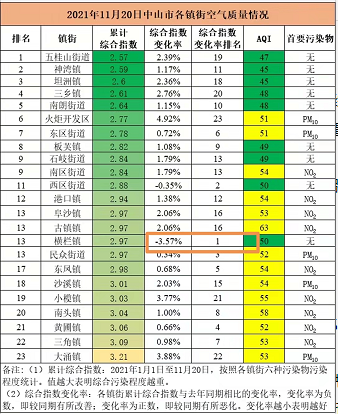 日前,中山市生態(tài)環(huán)境局公布了全市各鎮(zhèn)街空氣質(zhì)量最新情況。記者發(fā)現(xiàn),截至11月20日,中山橫欄鎮(zhèn)空氣質(zhì)量綜合指數(shù)變化率排名全市第一,是今年中山首個空氣質(zhì)量實現(xiàn)正改善的鎮(zhèn)街。