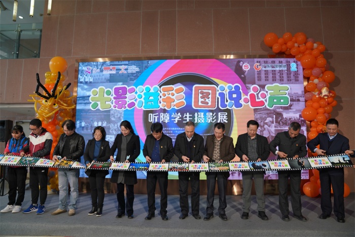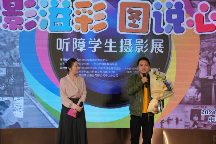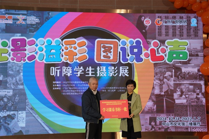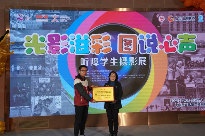 頒牌儀式上,中山市文化館為支持單位廣東廣電網(wǎng)絡(luò)中山市分公司授予感謝匾牌,歐派家居集團股份有限公司中山分公司為市特校捐贈課桌椅一批。隨后,引領(lǐng)聽障孩子入門的珠?!翱扉T無聲”公益項目創(chuàng)始人朱習(xí)女士對孩子們的成長表示驚喜和欣慰,“光影溢彩 圖說心聲”聽障學(xué)生攝影培訓(xùn)項目負(fù)責(zé)人、本次攝影展主要策展人之一賀億強先生表達(dá)了自己的感謝與激動,并對聽障孩子今后攝影學(xué)習(xí)作了詳細(xì)規(guī)劃?;顒又?,嘉賓與學(xué)生代表共同為本次開幕式剪彩,接著嘉賓們一同步入展區(qū),靜心賞鑒聽障孩子們用眼睛“聽到”的世界,用鏡頭記錄的生活,為明媚綻放的生命之光點贊!