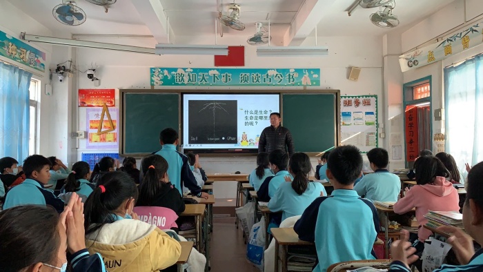 盧主任首先拋出問題“世界上什么東西最寶貴?”來引出話題“生命”,從孩子們學(xué)過的課文聊起,讓他們認識生命是神奇的偉大的。從生命的起源談起,讓他們懂得要珍愛生命、敬畏生命。通過視頻分享,引導(dǎo)學(xué)生感悟生命,保護自己的生命,不拿生命賭氣。盧主任還分享另外一個學(xué)校制作的視頻告訴孩子們:生活中我們會遇到各種各樣的困難,我們不僅要面對并解決還要珍愛生命,讓生命精彩地綻放!授課中,一幅幅圖片,喚醒了學(xué)生們對生命的理解;一次次互動,表達了學(xué)生們熱愛生命的心聲;一個個事例,激發(fā)了學(xué)生們直面挫折的決心。六(1)班學(xué)生認真聆聽,各抒己見,受益匪淺。
