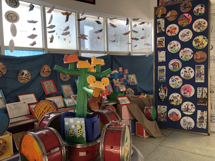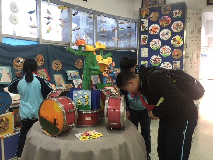 除此之外,安阜小學(xué)本次元旦畫展的一大亮點(diǎn)是傳達(dá)了環(huán)保的理念:學(xué)校美術(shù)興趣小組的同學(xué)們?cè)诶蠋煹膸ьI(lǐng)下把鼓號(hào)隊(duì)置換下來的舊小鼓變成了畫布,創(chuàng)作了一系列鼓面裝飾畫。為畫展增添了活潑的色彩。