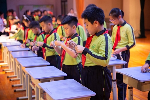 接下來由二年級同學帶來表演“速移漢諾塔”,他們分別表演3層、4層、5層、6層、7層,在臺下觀眾的歡呼中,二年級孩子們聚精會神,以最快的速度飛速移動著手中的漢諾塔,贏得了全場的贊譽。