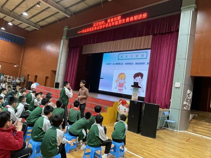 娉娉裊裊十三余,豆蔻梢頭二月初。青春期是青少年身心快速發(fā)展的重要階段,是學(xué)生成長的關(guān)鍵期。為引導(dǎo)學(xué)生正確對待青春期身體和心理的變化,減少青春期所引起的種種困惑對學(xué)生的學(xué)習(xí)、生活造成不良影響,幫助他們更健康、更快樂地度過青春期,2023年3月27日上午,中山市東區(qū)水云軒小學(xué)分別為五年級的男生和女生帶來一場有趣又有用的青春期健康知識講座。