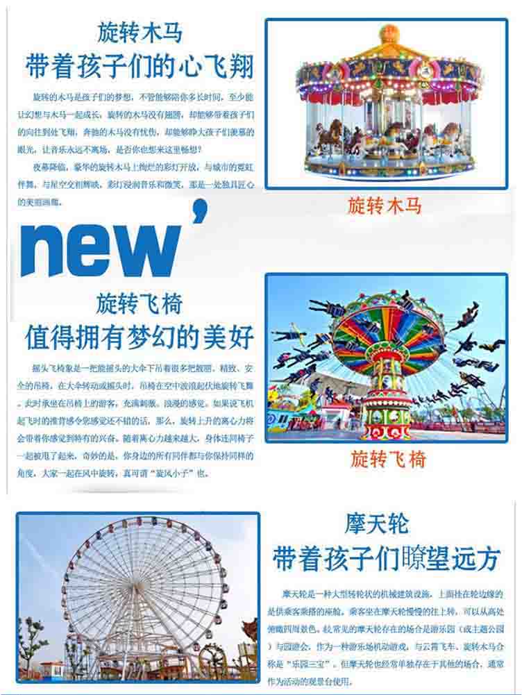 主營(yíng)產(chǎn)品為:過(guò)山車(chē)、摩天輪、大型飛椅、轉(zhuǎn)馬、滑車(chē)、玻璃吊橋、小火車(chē)、大擺錘、玻璃棧道等機(jī)械設(shè)備和景區(qū)戶(hù)外設(shè)備,我們相信通過(guò)我們的不斷努力和追求,一定能實(shí)現(xiàn)與客戶(hù)的互利共贏。