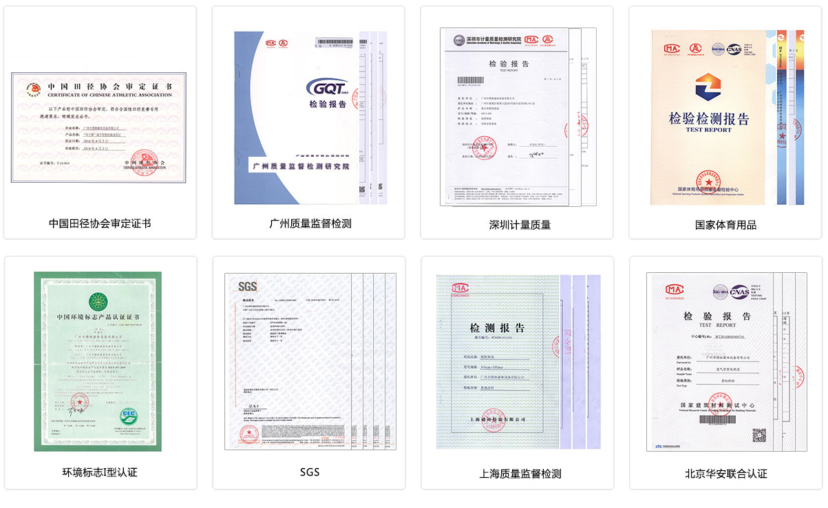 塑膠跑道獲得:中國田徑協(xié)會審定證書、廣州質(zhì)量監(jiān)督檢測、深圳計量質(zhì)量、國家體育用品、環(huán)境標志I型認證、SGS、上海質(zhì)量監(jiān)督檢測、北京華安聯(lián)合認證等。
