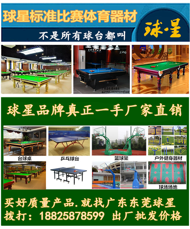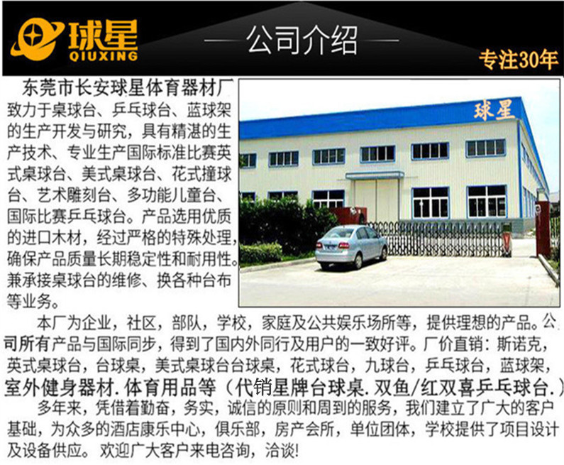 東莞市長(zhǎng)安球星體育器材廠集三十多年管理、制造經(jīng)驗(yàn),專業(yè)制造桌球臺(tái)、乒乓球臺(tái)、籃球架、桌上足球.公園.小區(qū)健身器材等./等體育用品。秉著質(zhì)量至上,信譽(yù)好的原則,所做產(chǎn)品深受客戶好評(píng)。桌球臺(tái)、乒乓球臺(tái)、籃球架.桌上足球.公園小區(qū)健身器材五個(gè)系列產(chǎn)品遠(yuǎn)銷歐洲,南、北美洲,澳大利亞及部分阿拉伯**。