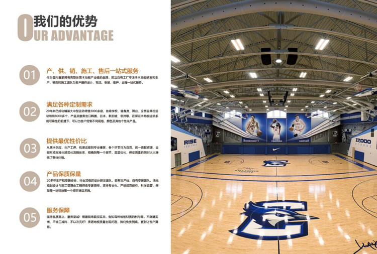 全新的高度。防潮、防腐性、抗變形、環(huán)境適應力等方面全面優(yōu)于其他結(jié)構(gòu)系統(tǒng)。不但滿足了運動地板的各種技術(shù)要求,而且實現(xiàn)了更好   的運動性能,整個地板的性能比較均勻,非常適合籃球等專業(yè)比賽運動。
