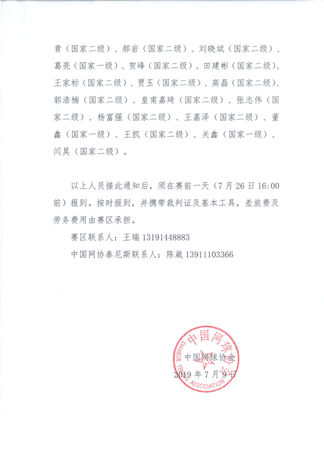 關(guān)于選派2019年中國(guó)業(yè)余網(wǎng)球公開(kāi)賽日照鉆石賽技術(shù)官員的通知