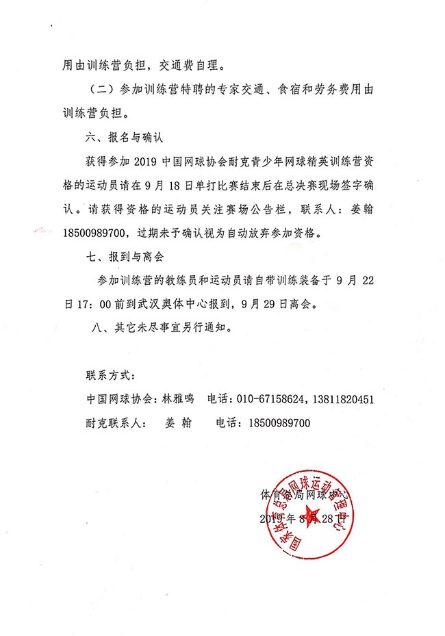 體育總局網球中心關于舉辦2019中國網球協(xié)會耐克青少年網球精英訓練營的通知