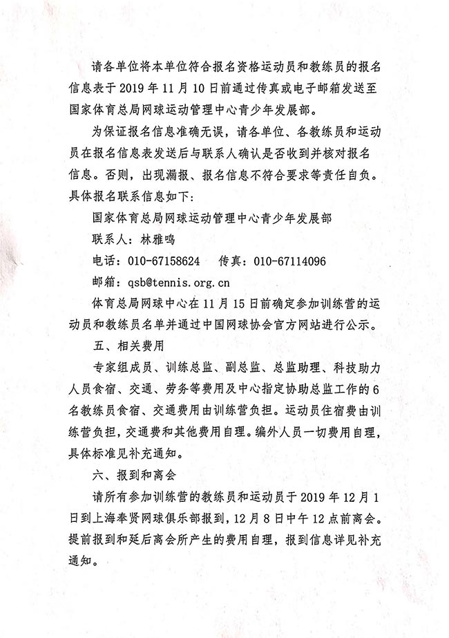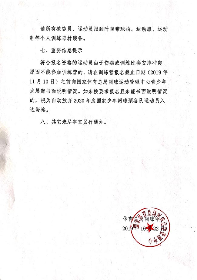 2020年國家少年網(wǎng)球隊運動員選拔訓練營補充通知