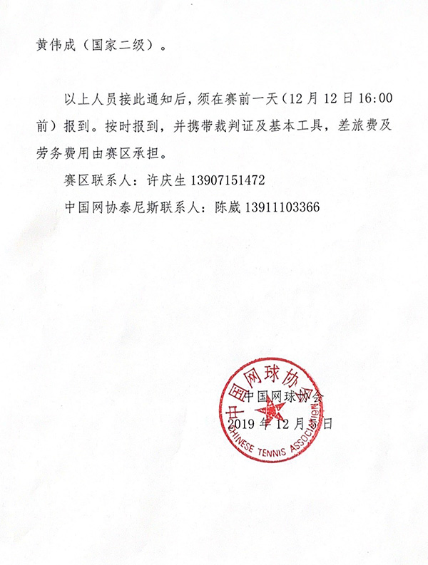關(guān)于選派2019年中國業(yè)余網(wǎng)球公開賽年終總決賽技術(shù)官員通知 2019-12-11 09:06:00 中國網(wǎng)球協(xié)會(huì)