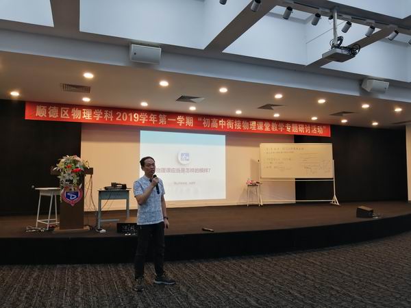 9月18日,順德區(qū)物理學(xué)科“初高中銜接物理課堂教學(xué)專題研討活動”在廣東順德德勝學(xué)校順利開展,參加活動的人員有佛山市教研室物理教研員朱建平教授、順德區(qū)教育發(fā)展中心教研室任富華副主任、100多位初高中物理教師。活動由順德區(qū)物理教研員周璐老師主持。
