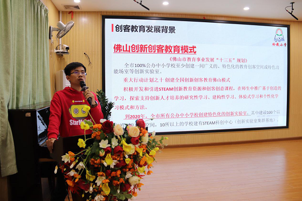 林慶河副校長介紹順德區(qū)倫教小學(xué)創(chuàng)客教育開展情況以及星創(chuàng)空間未來建設(shè)設(shè)想