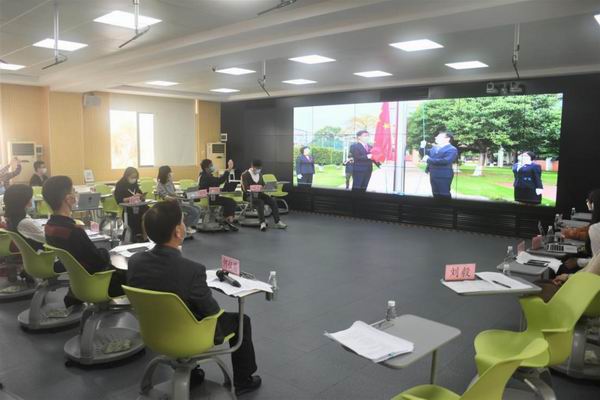 與會(huì)人員觀看勒流中學(xué)線上“升旗儀式”
