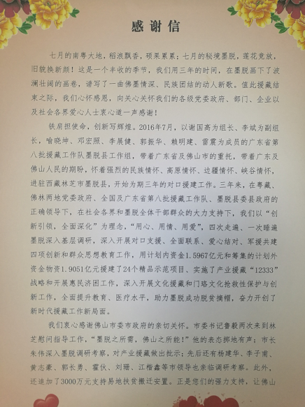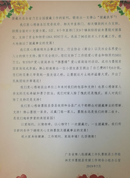 2019年6月,我校被廣東省第八批援藏工作隊(duì)墨脫縣工作組和林芝市墨脫縣受援工作領(lǐng)導(dǎo)小組辦公室授予“援藏事業(yè)功勛單位”稱號(hào),并于日前收到來自西藏墨脫縣的牌匾和感謝信。