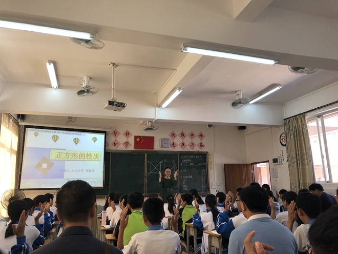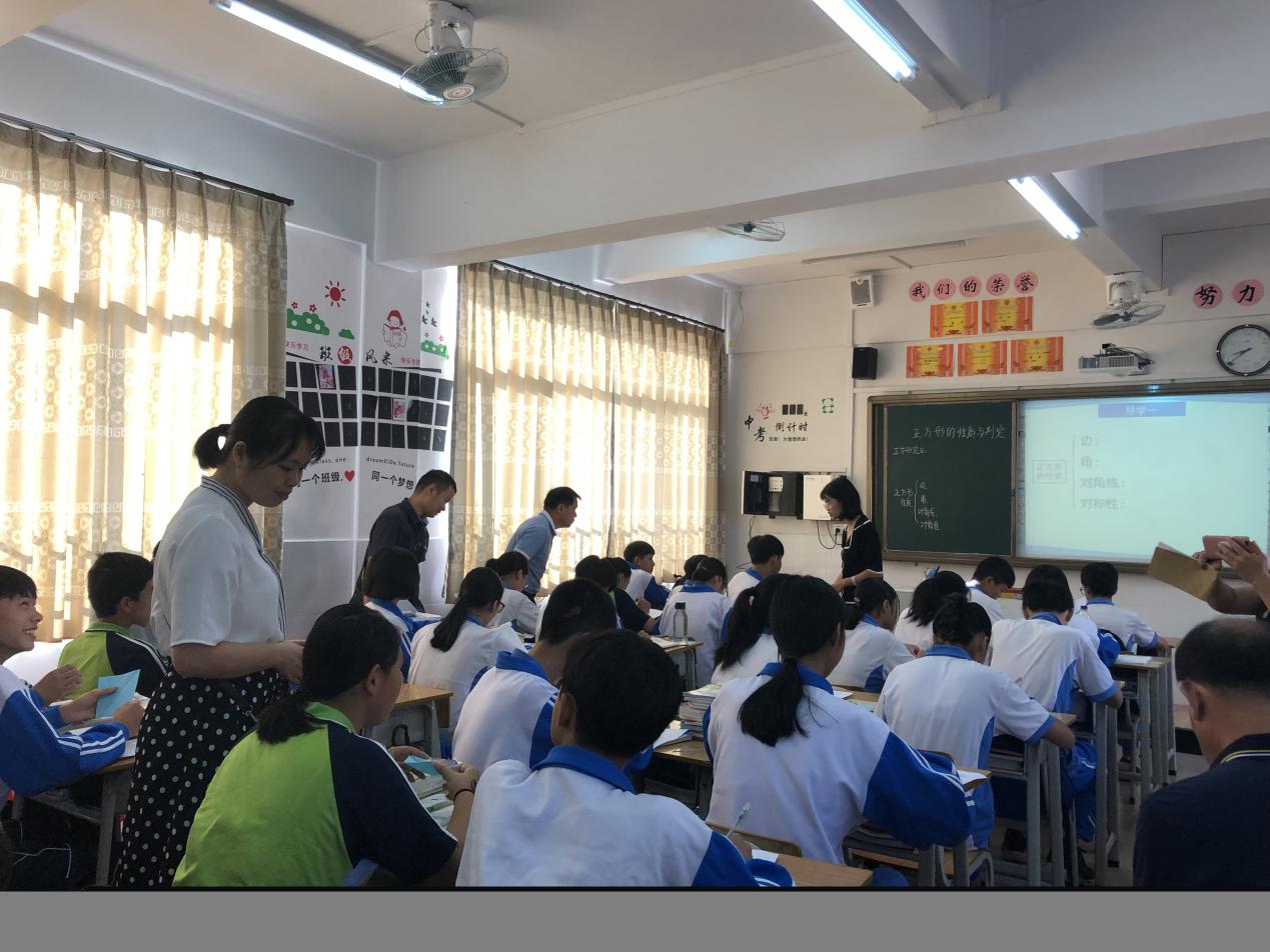 第一堂課是由吳穎芝老師執(zhí)教的北師大版九年級(jí)上冊(cè)第一章1.3.1《正方形的性質(zhì)和判定》第一課時(shí),吳老師教態(tài)自然,語(yǔ)言親切,通過(guò)剪紙加深學(xué)生印象,體會(huì)到數(shù)學(xué)中圖形的奇妙。由學(xué)生小組合作進(jìn)行探究、展示思維導(dǎo)圖。吳老師注重引導(dǎo)學(xué)生進(jìn)行自主探究、發(fā)現(xiàn)從不同的角度發(fā)現(xiàn)問(wèn)題并總結(jié),給學(xué)生提供充分的學(xué)習(xí)自由度,調(diào)動(dòng)學(xué)生學(xué)習(xí)積極性。