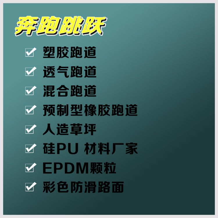 PU顆粒、顏料、助劑、填料組成。塑膠跑道具有平整度好、抗壓強(qiáng)度高、硬度彈性適當(dāng)、物理性