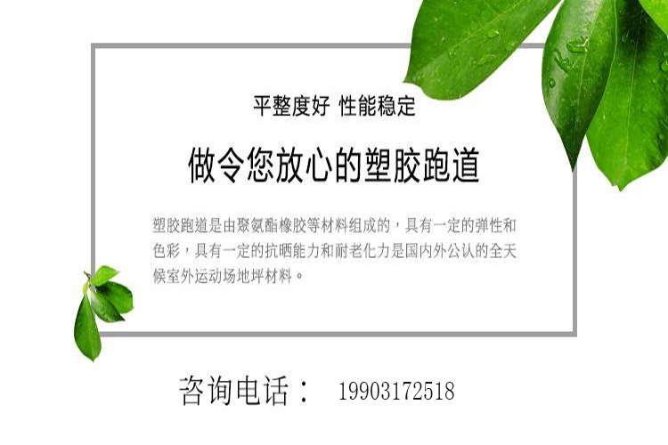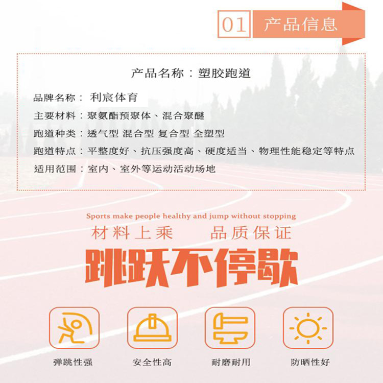 環(huán)保性:采用新型環(huán)保原料,不危害使用者健康;在材料配方上依據(jù)不同地區(qū)陽(yáng)光紫外線的數(shù)據(jù)來(lái)調(diào)整使用紫外線吸收劑及抗氧劑等,能有效延緩老化;不易脫粒、開(kāi)裂、起泡,從而極少產(chǎn)生影響環(huán)境衛(wèi)生的塑膠顆粒;耐摩擦、耐酸堿、耐老化,使用壽命長(zhǎng)。2、安全性:根據(jù)不同場(chǎng)地的要求,調(diào)整材料的厚度、彈性和摩擦系數(shù),以適合不同運(yùn)動(dòng)對(duì)安全的要求;彈性適度、防滑性好,能有效保護(hù)運(yùn)動(dòng)員的韌帶、肌肉、皮膚,以防拉傷或擦傷;適度的緩沖性可適度地吸收腳步的沖擊力,減少運(yùn)動(dòng)傷害。3、有效性:材料的各種系數(shù)的可調(diào)節(jié)性便于針對(duì)不同運(yùn)動(dòng)特性的場(chǎng)地使用能提高運(yùn)動(dòng)效率的材料;通過(guò)使用透氣、透水的材料和相應(yīng)的施工工藝,可滿足場(chǎng)地的全天候使用的要求,即使大雨剛過(guò),也可立即投入使用;適度的彈性可減少體力消耗,從而可增加訓(xùn)練時(shí)間或增進(jìn)競(jìng)賽成績(jī);較強(qiáng)的抗釘力和耐壓縮性可將釘鞋、體育器械對(duì)場(chǎng)地的破壞減至少,使場(chǎng)地保持一貫的有效性;專業(yè)的施工和使用自流平材料,可使表面更平坦,從而更有效地訓(xùn)練和比賽;美觀的外觀和顏色搭配,在心理上對(duì)運(yùn)動(dòng)效率有積極作用。產(chǎn)品外觀:水白色或微黃色澄清透明液體
