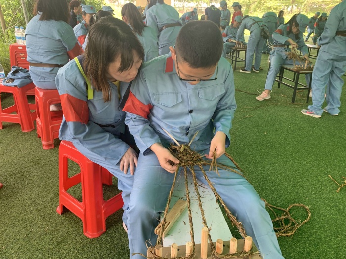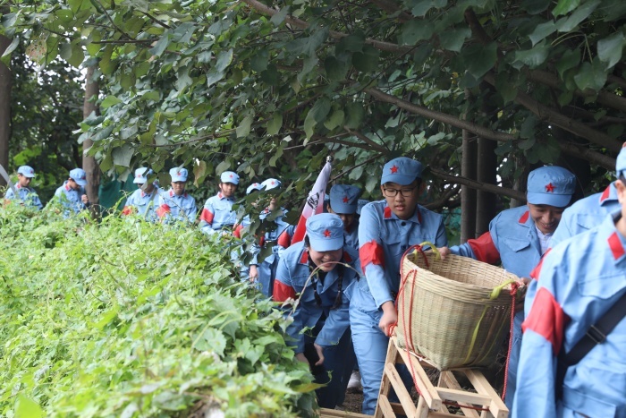 達到指定地點后,學生和家長們迅速換好軍裝,整理好隊形,斗志昂揚地參加研學的第一項活動“重走長征路”。此項活動,由學生和家長合力組成4路縱隊,“重走長征路”,體驗長征途中紅軍運送物資的艱辛。緊接著,以家庭為單位開展“編草鞋”的有趣活動。通過兩項活動,大家意識到紅軍在物質(zhì)資源極度匱乏的情況下長征的艱辛和困苦。