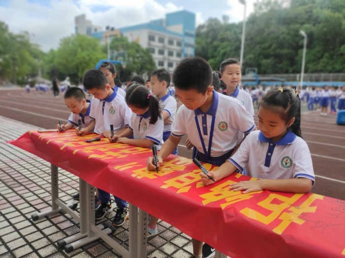 接著該校周瑞珍校長、馮麗芬副校長和教師代表、以及各班的學生代表共同在橫幅上簽名,簡單而莊嚴的簽名儀式,表明了全校師生“珍惜糧食 拒絕浪費”的共同決心。