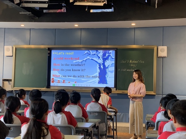 首先,博凱小學(xué)的游彩霞老師圍繞課題上了一節(jié)故事示范課。游老師執(zhí)教的是四年級(jí)下學(xué)期《Weekend Fun》story部分。游老師以節(jié)奏歡快的英語(yǔ)歌曲熱場(chǎng),地道的英語(yǔ)發(fā)音,極強(qiáng)的表現(xiàn)力和感染力,讓課堂充滿了激情和活力。學(xué)生在輕松愉快的氛圍中發(fā)展了語(yǔ)言和思維,在情景中體驗(yàn)著學(xué)習(xí)英語(yǔ)的快樂。游老師根據(jù)故事內(nèi)容,以圖片環(huán)游的方式幫助學(xué)生去理解故事內(nèi)容。通過創(chuàng)設(shè)情境,引導(dǎo)學(xué)生觀察圖片,并根據(jù)故事文本設(shè)置了不同的問題,由簡(jiǎn)入難層層深入故事學(xué)習(xí)。課堂教學(xué)環(huán)節(jié)科學(xué)有效,很好的實(shí)現(xiàn)了教學(xué)目標(biāo)。游老師通過手繪圖片搭建思維導(dǎo)圖,生動(dòng)新穎的板書極大程度上吸引學(xué)生的學(xué)習(xí)興趣。完成故事文本教學(xué)后,游老師注重引導(dǎo)學(xué)生根據(jù)思維導(dǎo)圖進(jìn)行復(fù)述。孩子們認(rèn)真思考,積極參與復(fù)述環(huán)節(jié)。大部分孩子表現(xiàn)得自信大方,能正確運(yùn)用思維導(dǎo)圖上的關(guān)鍵詞進(jìn)行故事復(fù)述,所表達(dá)的信息準(zhǔn)確且完整。孩子們流暢、生動(dòng)的復(fù)述將本節(jié)課的故事教學(xué)推向了高潮。游老師及時(shí)對(duì)孩子們的復(fù)述情況進(jìn)行適當(dāng)評(píng)價(jià),效果良好。