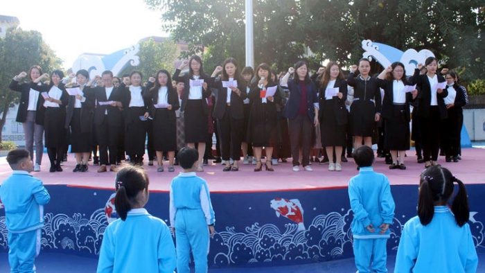 最后,胡冬梅校長(zhǎng)還帶領(lǐng)全體教師在莊嚴(yán)的國(guó)旗下進(jìn)行了人民教師宣誓。