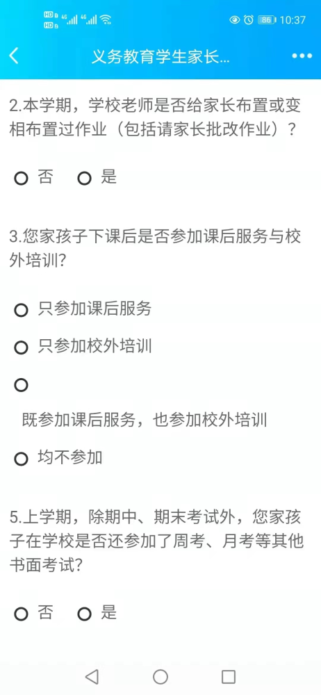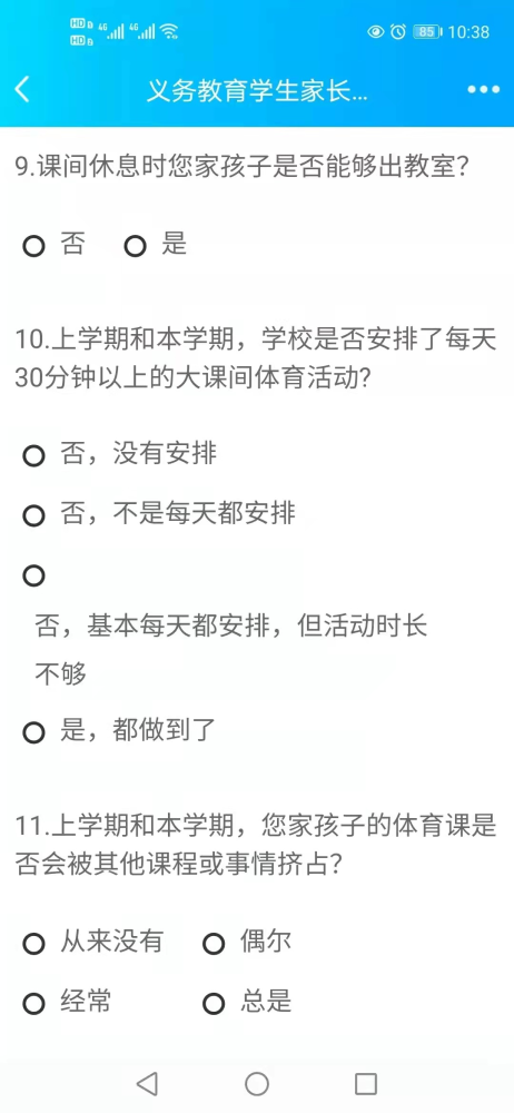這幾年國家有很多教育政策出臺,但這些政策下面的學(xué)校執(zhí)行得怎么樣,上級教育部門未必知道。為了了解各項教育政策的落實情況,上級每年都要舉行一次調(diào)查問卷,問卷的名稱就是《義務(wù)教育學(xué)生家長調(diào)查問卷》,從名稱來看,就是讓學(xué)生和家長填的。