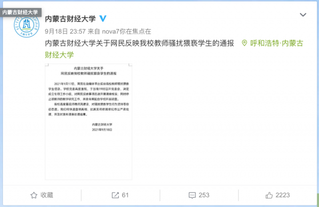 9月18日深夜,@內(nèi)蒙古財(cái)經(jīng)大學(xué) 發(fā)布通報(bào)稱,9月17日,網(wǎng)民在自媒體平臺(tái)反映我校教師騷擾猥褻學(xué)生信息。學(xué)校黨委高度重視,于當(dāng)晚19時(shí)召開(kāi)黨委會(huì),決定成立專項(xiàng)工作小組,對(duì)網(wǎng)民反映事項(xiàng)迅速開(kāi)展調(diào)查核實(shí);同時(shí)停止該教師的教學(xué)研究工作,并責(zé)令其配合學(xué)校開(kāi)展調(diào)查。