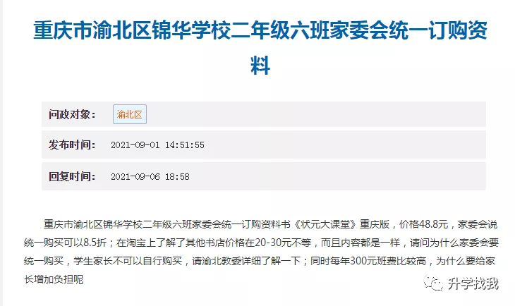 9月1日,有網(wǎng)友在重慶網(wǎng)絡(luò)問(wèn)政平臺(tái)舉報(bào),家委會(huì)統(tǒng)一訂購(gòu)資料《狀元大課堂》, 還提到每學(xué)期300元的班費(fèi),收費(fèi)太高。