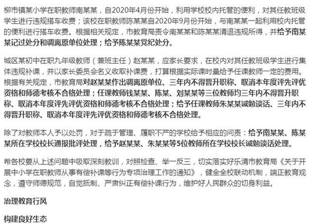 浙江樂清市還在同一時(shí)候,處理了兩位教師搭車收費(fèi)的問題。柳市鎮(zhèn)某小學(xué)在職教師南某某,自2020年4月份開始,利用學(xué)校校內(nèi)托管的便利,對(duì)班上學(xué)生進(jìn)行違規(guī)搭車收費(fèi);陳某某自2020年9月份開始,與南某某一起利用校內(nèi)托管的便利進(jìn)行搭車收費(fèi)。