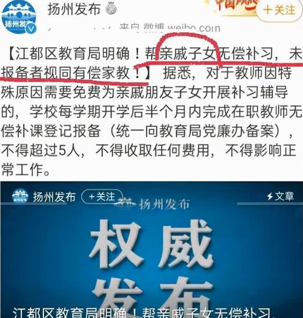 在這一問題出現(xiàn)后,揚州地區(qū)的相關(guān)部門發(fā)布消息,表示教師為親戚子女補課,需提前報備,沒有進行報備的補課活動視為有償家教。如果教師的補課行為被認(rèn)同為有償家教的話,屬于嚴(yán)重違規(guī)現(xiàn)象,教師也可能面臨被辭退。