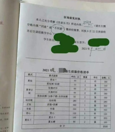 “天價(jià)校服”賬單出爐,一家長(zhǎng)勇敢簽下“不同意”