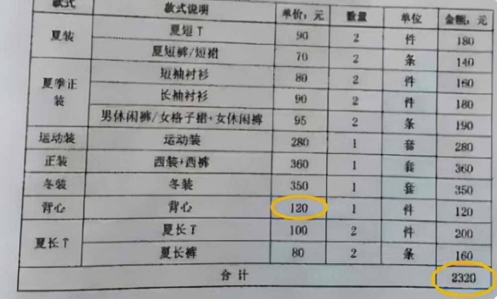 可能是怕小學生表達不清楚,學校特地把校服的明細打印了出來,從校服繳費單中我們可以看到,大大小小的校服一共18件,最便宜的短裙、短褲是70一件,而最貴的是冬裝,需要350一套,總共加起來是2320元的校服費用。