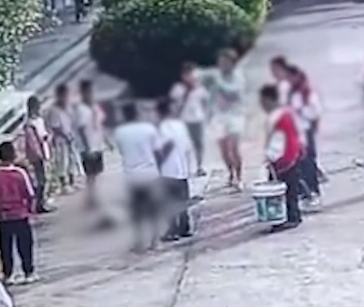 從監(jiān)控視頻中可以看到,事發(fā)時(shí)數(shù)名小學(xué)生正在操場(chǎng)上打掃衛(wèi)生,其中兩名小學(xué)生也不知道發(fā)生了什么矛盾(也許是在玩鬧?),一人手持火鉗悄悄靠近另一人,往其身上輕輕打了一下,真的就是輕輕打了一下,更像是挑釁行為。