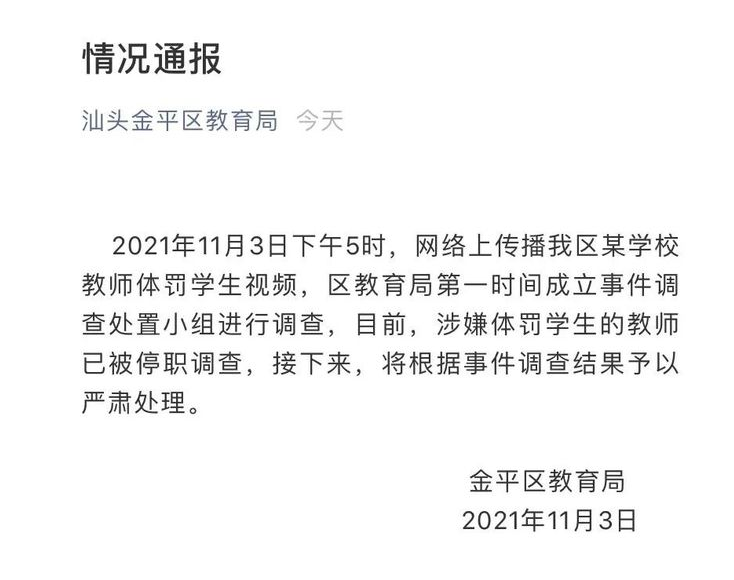 輿論發(fā)酵后,汕頭教育局隨后發(fā)布通報,表示涉事男教師正在接受停職審查。