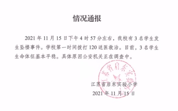 據(jù)媒體報(bào)道,11月15日下午4時(shí)57分許,位于江蘇省啟東市的一處小學(xué)教學(xué)樓內(nèi),三名女學(xué)生從5樓墜落,學(xué)校工作人員發(fā)現(xiàn)情況后,立刻撥打了120求助,在急救人員趕到現(xiàn)場(chǎng)后,對(duì)3名學(xué)生進(jìn)行了救治。