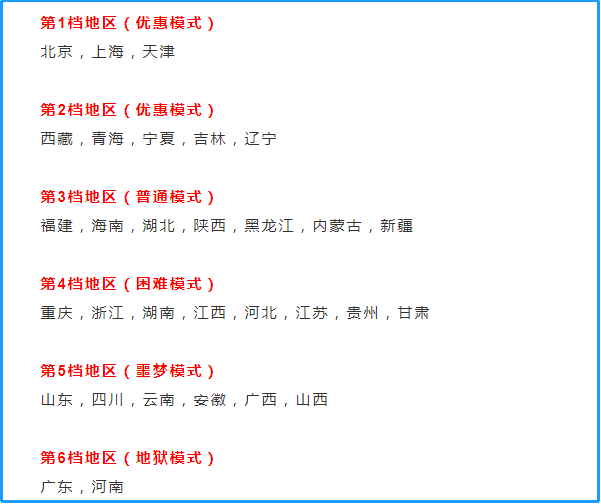 第三檔次被定為“普通模式”,這些地區(qū)的考生經(jīng)歷的高考難度在全國(guó)范圍內(nèi)屬于正常水平,沒(méi)有優(yōu)惠,但是也沒(méi)有過(guò)分的競(jìng)爭(zhēng)壓力。