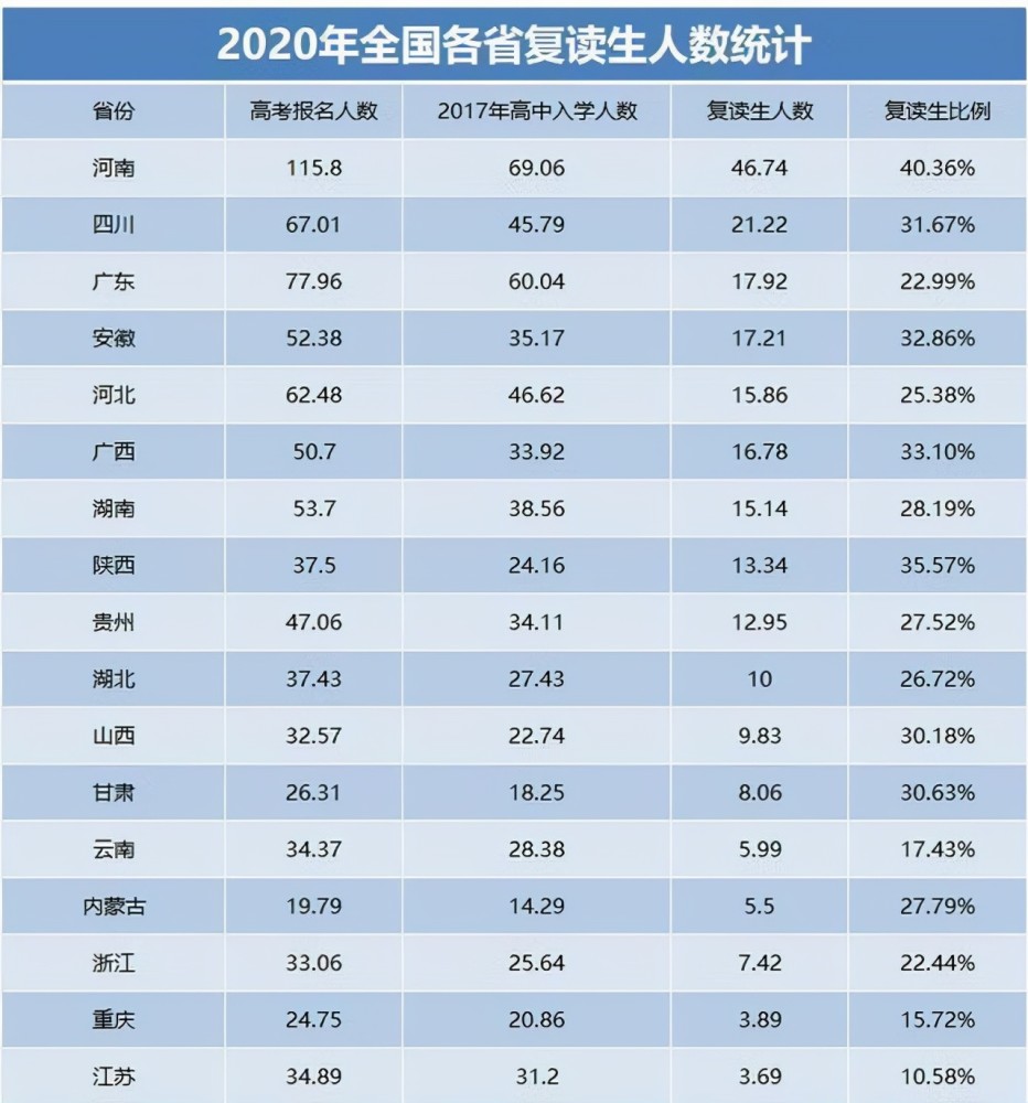 2、2020年,全國高考復(fù)讀生也達(dá)到了200多萬人。據(jù)統(tǒng)計,河南省高考復(fù)讀生最多,達(dá)到了46.74萬人,復(fù)讀生比例是40.36%,相當(dāng)于許多省、市的高考報名人數(shù)。