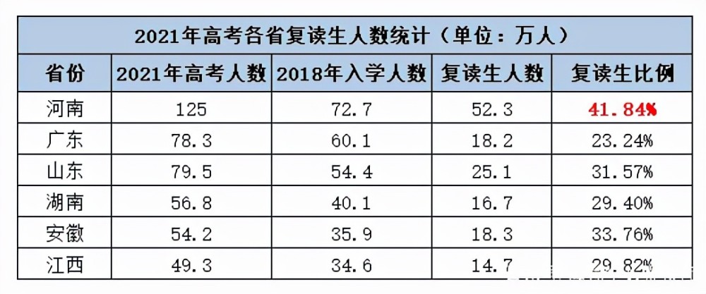 2021年高考復(fù)讀生人數(shù)占比最高的,仍然是河南省,有52.3萬參加高考復(fù)讀,復(fù)讀率是41.84%。安徽省、山東省高考復(fù)讀生占比均超過了30%。湖南省、江西省高考復(fù)讀生比例近30%。