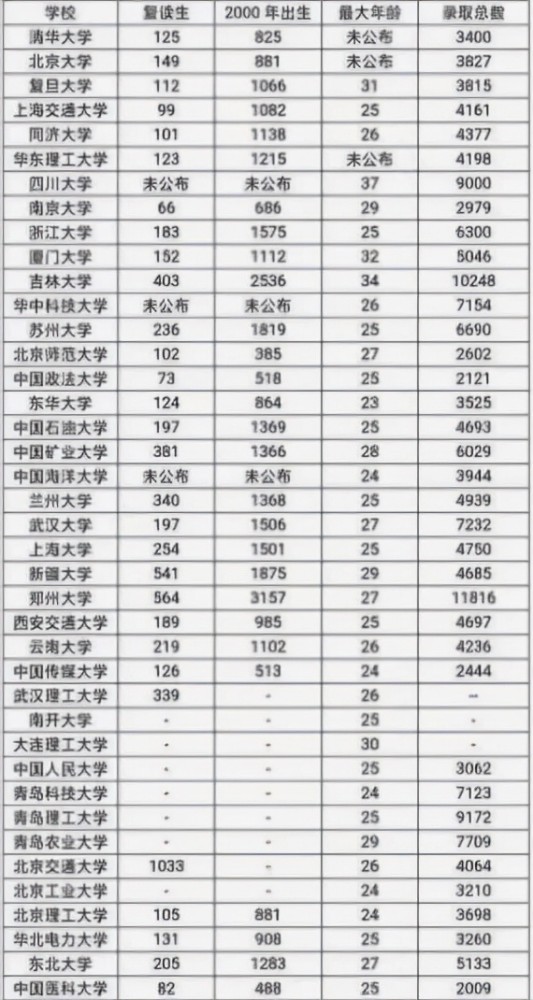 2021年,清華大學(xué)錄取了125名高考復(fù)讀生,占比是3.29%。北京大學(xué)錄取了149名高考復(fù)讀生,占比約為5.32%。復(fù)旦大學(xué)、上海交通大學(xué)、浙江大學(xué)、四川大學(xué)、同濟大學(xué)、南京大學(xué)、廈門大學(xué)、吉林大學(xué)等985工程大學(xué),都不同程度上錄取了高考復(fù)讀生。