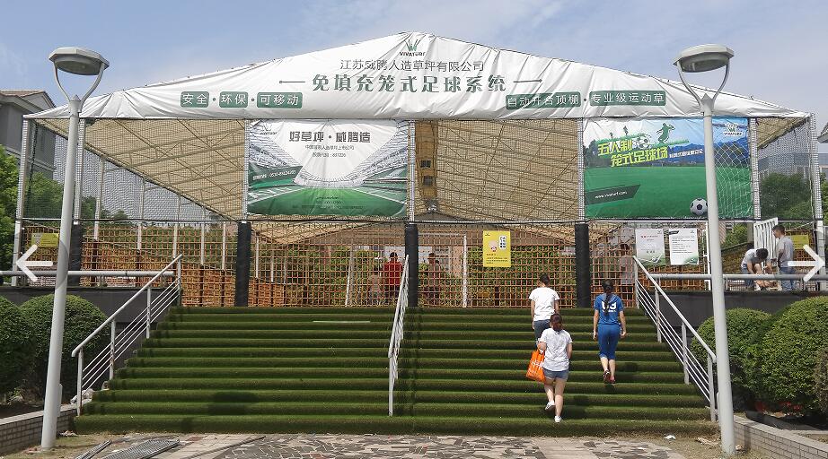 在威騰草坪所在的無錫國家工業(yè)設(shè)計園創(chuàng)意園園區(qū)內(nèi),一座可拆卸式的籠式足球場在樹木掩映中悄然矗立,四面圍網(wǎng)+封閉式頂棚使它顯得不那么高調(diào),籠式足球場內(nèi)外蔥翠的人工草坪與周圍的自然植物渾然一體,幾可亂真。